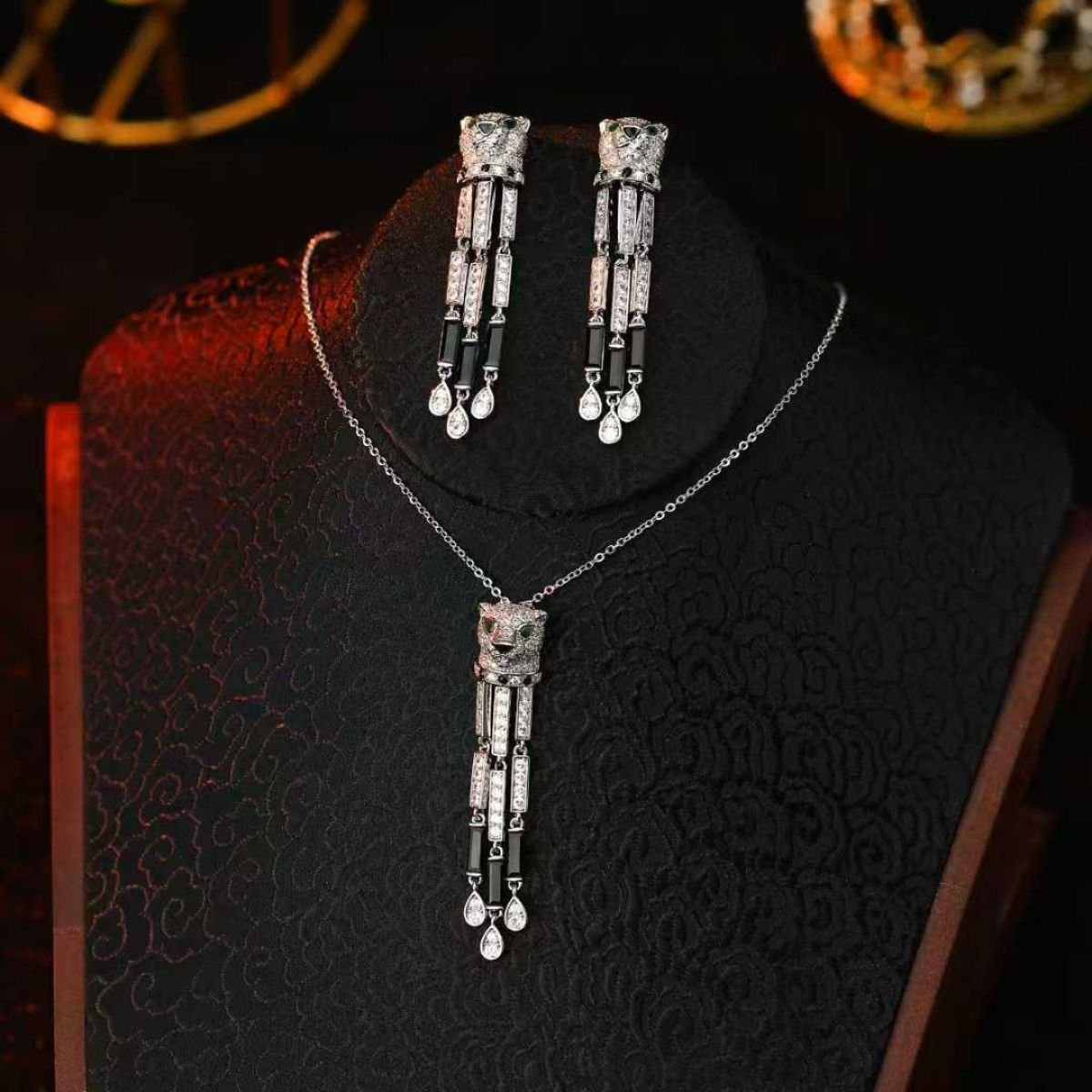L’ensemble Cartier Panthère, composé d’un collier et d’une paire de boucles d’oreilles, est une création emblématique de la haute joaillerie de luxe. Inspirée de la panthère, symbole historique de la Maison Cartier, cette collection incarne une féminité affirmée, élégante et audacieuse.