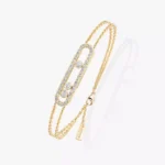 The pink gold is very trendy these last years as it prevailed in luxury jewelry. Its luminous and original color will be favored by the women who seek a unique luxury jewel. This 18 carat pink gold pavé diamond bracelet, fully handcrafted, and set with three 0.08 carat brilliant cut diamonds in motion is part of the Move luxury jewelry collection, icon of Messika House. Its modern design, the curves of precious and feminine cage and the three diamonds in motion enlighting every moments feature this IT luxury jewel. The motion of the three diamonds -symbols of the love of yesterday, today and tomorrow – enhances the purity of the fine stones selected with a great care. This double pink gold pavé diamond bracelet Move is perfect to embody a precious moment and will embrace your cuff with strength and boldness. Let be seduced by the elegant originality of this pink gold diamond double bracelet and discover online all Messika’s diamond bracelet for women!