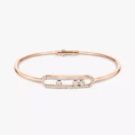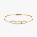 Discover the 18 carat white gold thin bangle bracelet, fully handcrafted and set with three brilliant cut diamonds is part of the Move luxury jewelry collection, icon of Messika House. The white diamond bangle bracelet minimalism is balanced by the three diamonds moving playfully within the precious pavé cage. This fine diamond jewel has a clasp to screw with one hand. The white gold is very easy to wear and fits any wardrobe with a natural stylish touch. Play with the stacking trend and wear this white gold diamond thin bangle bracelet with another diamond bracelet for women! Find the perfect match with Messika’s diamond bangle bracelets and discover online all the luxury jewelry for women and men!